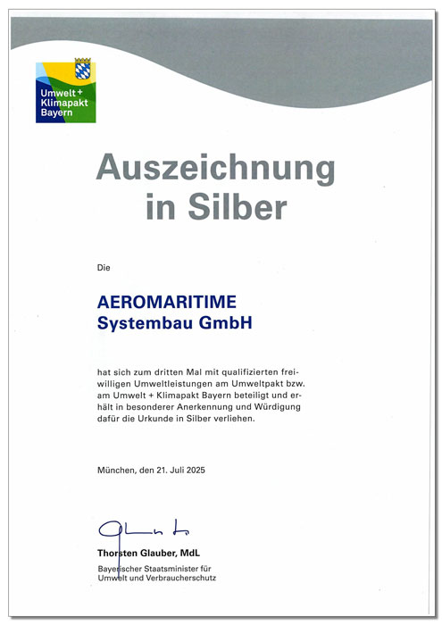 On July 21, 2025, Aeromaritime was honored with the Silver Certificate by the Bavarian State Ministry for the Environment and Consumer Protection as part of the Environmental and Climate Pact of Bavaria. The award ceremony took place at the historic Munich Residenz, where Minister Thorsten Glauber presented the certificate to Belen Gimenez, Enviromental Manager, who accepted the award on behalf of Aeromaritime.